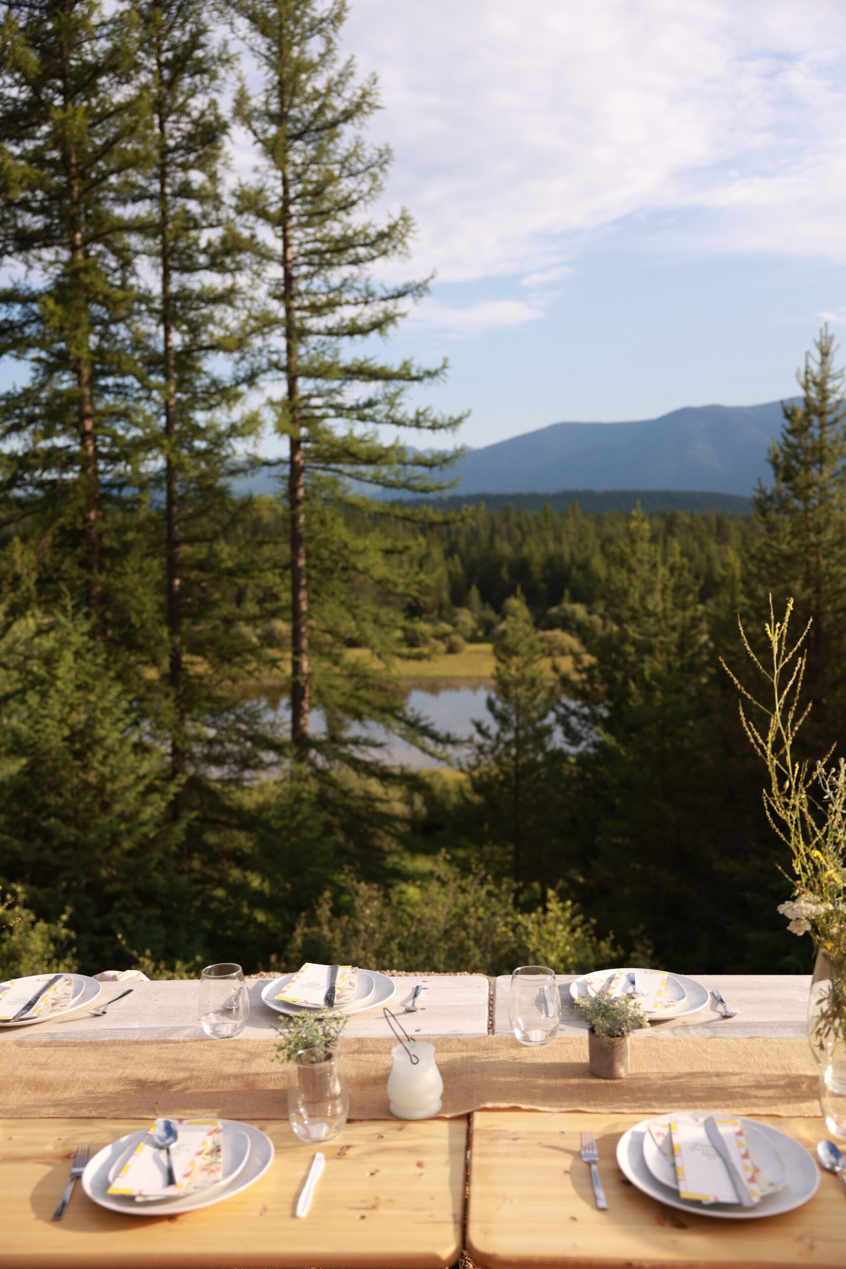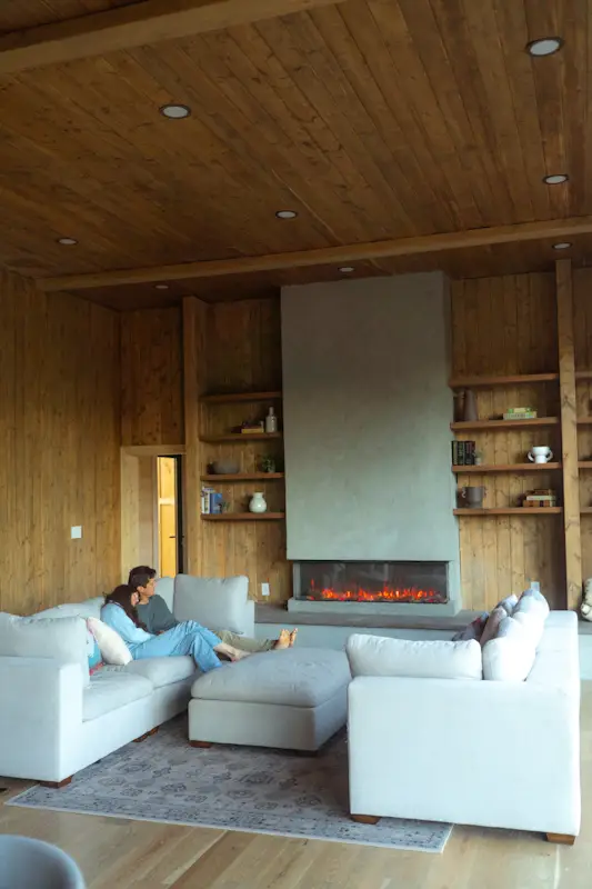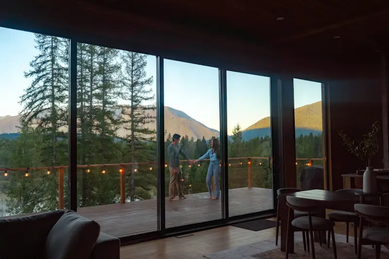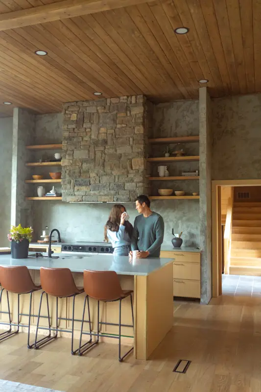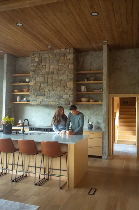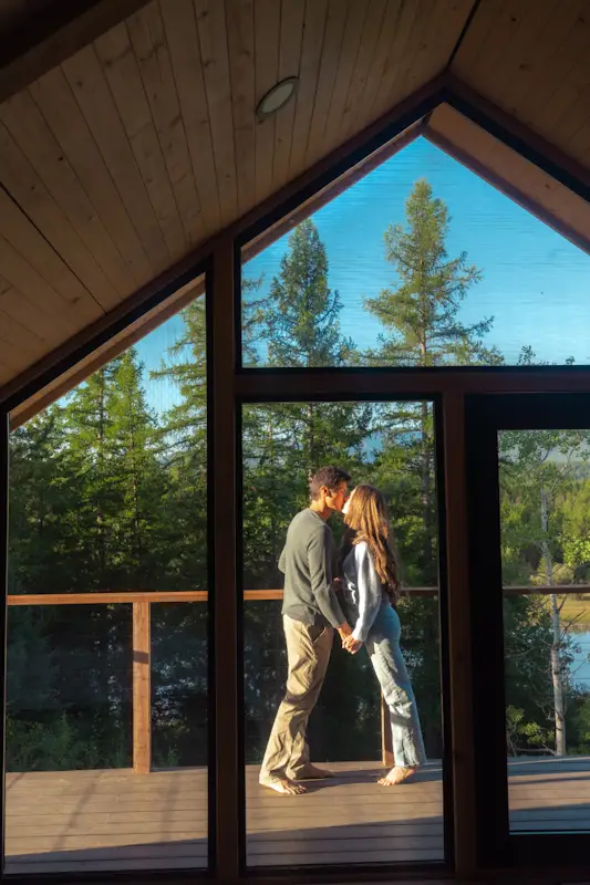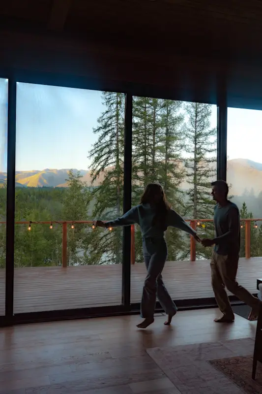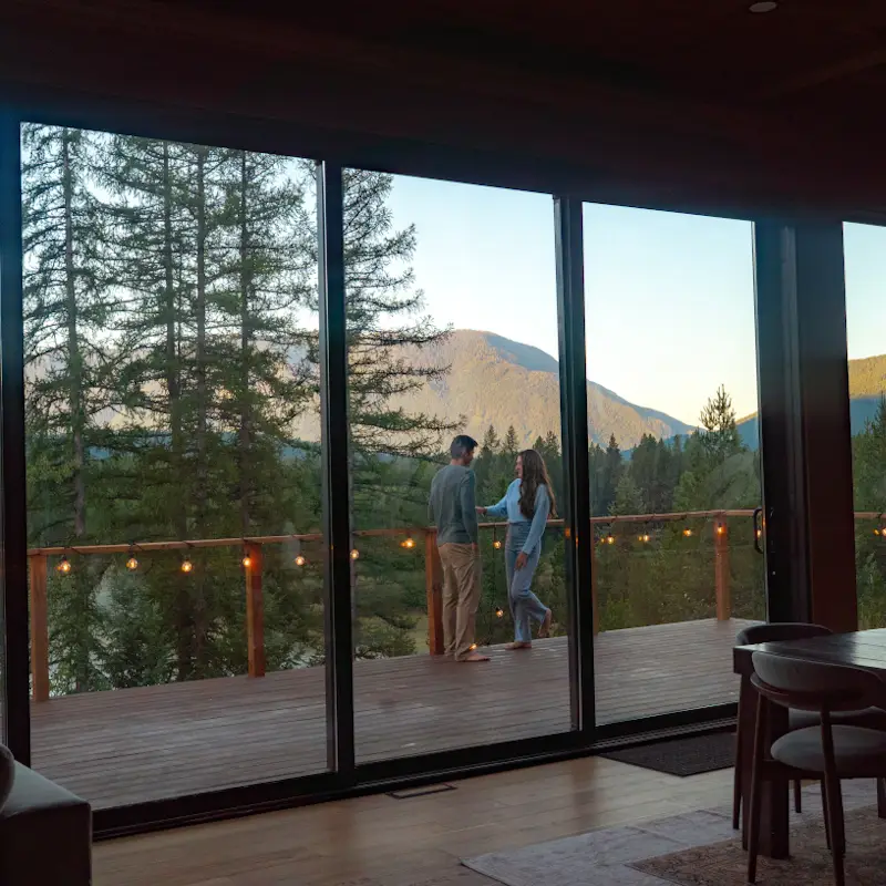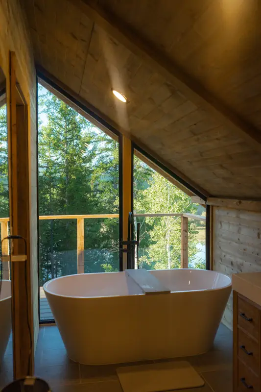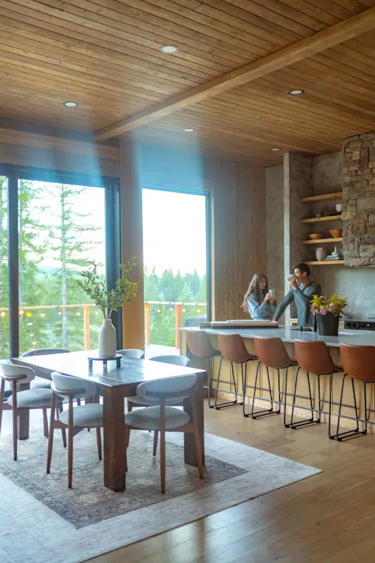Originally constructed in 1940, the Glacier Lodge is a 5000 sq ft newly renovated cabin set amongst 40 acres of mountain views overlooking our private pond. The lodge has 4 king suites (each with a king bedroom, ensuite bathroom, coffee nook,  living room with sleeper couches, and big mountain views) that open up via breezeway to a central area with chef’s kitchen, great room, and dining area.